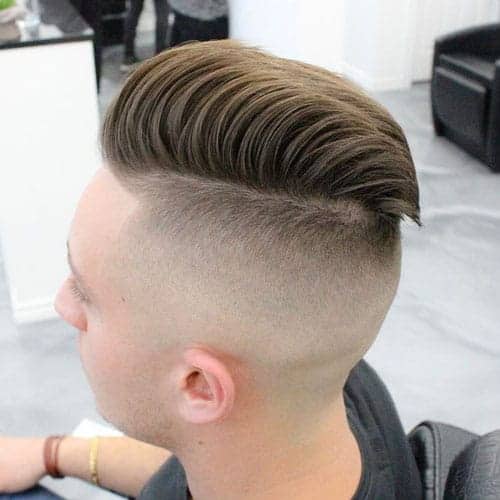This particular hairstyle borrows its concept from the Mohawk trend by keeping the middle patch of hair on top intact and long. It’s actually a hybrid between taper fade and faux hawk style, with a significant amount of brush work to generate a premium hair texture on top.