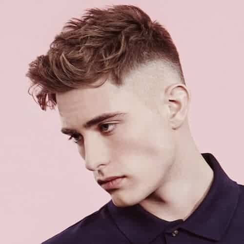 The taper at the sides starts rather abruptly from the top. All the hair can be colored to a dark crimson or faded caramel – the saturation is left up to your preference. Mess it up with an upward flick and laid down strands to generate this unique college high taper fade haircut!