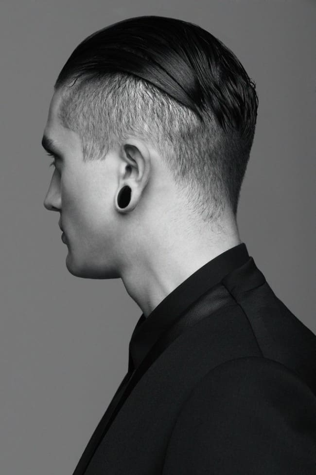 The top portion should be kept at medium length and sleekly brushed from one side to the other. You can use hair shiner spray or balm to create a glossy effect. The sides should begin the taper fade at the mid level climbing all the way down to expose your skin. Grow a beard to make it more striking for the audience!